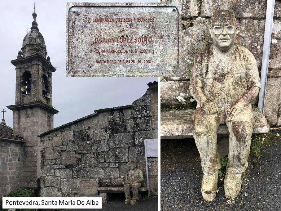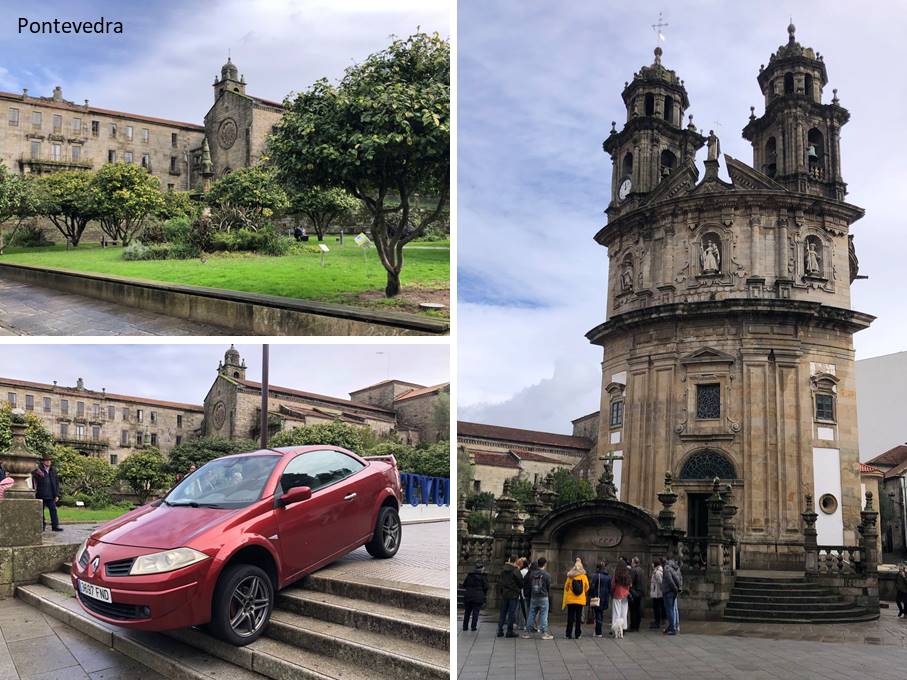 In Pontevedra gab es eine Menge zu sehen, zum Beispiel schöne Fassaden und Häuser mit kunstvoll verzierten Loggien aus Eisen und Glas. Anziehungspunkt mitten in der Stadt ist die hohe, runde Kirche „Capela da Virxe Peregrina“, wo man in die barocke Kuppel hochsteigen kann, wenn einem die Beine noch nicht wehtun. Ein Stück weiter geht es die Treppen hoch zum „Convento de San Francisco“, das heißt, zum Franziskanerkloster. Die dortige Kirche, die an sich nicht zu meinen Favoriten zählt, zeichnet sich dadurch aus, dass da wohl alle Heiligen einen Platz an einem der vielen Altäre oder auf Sockeln an der Wand gefunden haben. Erfreulicherweise sind sie fast alle beschriftet, denn nicht jeder ist an seinen Insignien sofort zu erkennen. Interessanterweise hat fast jeder der Heiligen eine mit seinem Namen beschriftete Spendenbox zu seinen Füßen. Wie das nach der Leerung buchhalterisch erfasst und den jeweiligen Heiligen zugestellt wird, würde mich mal interessieren. Die am meisten fotografierte Sehenswürdigkeit war in Pontevedra aber ein Renault, der (vermutlich von Google fehlgeleitet) die Treppe statt eine der Straßen genommen hat.