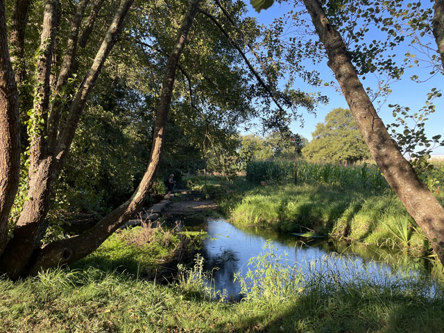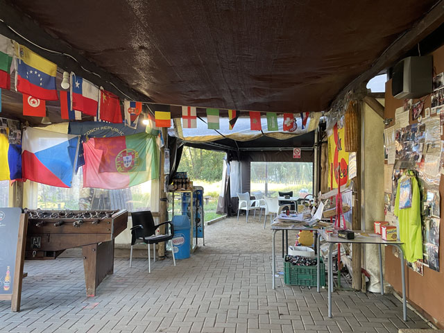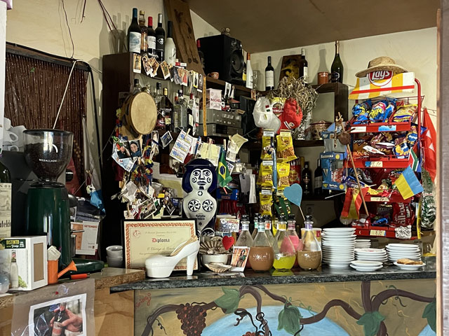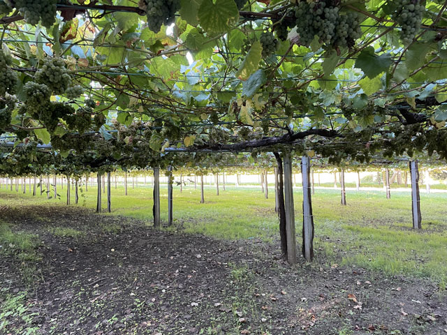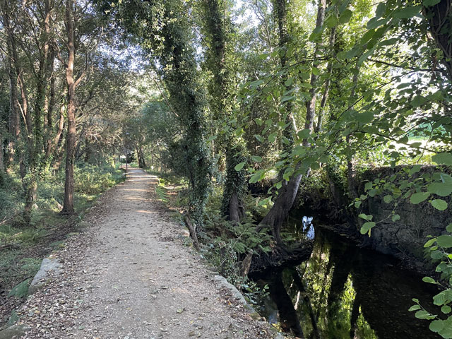 Das war alles ziemlich genau so wie vor zwei Tagen, nur dass es dieses Mal bergab ging, was der Sache noch mehr Spaß verlieh. Das viele Fotografieren hat da wieder ganz schön aufgehalten. Aber auch alle anderen Pilger sind laufend stehen geblieben. Heute waren ja mal ein paar mehr unterwegs. Meine Herberge hatte 24 (nicht wie angegeben 17) Betten. Davon sind zwar ein paar frei geblieben, aber knapp 20 Leute sind allein von dort abwärts gestrebt und es gab ja auch noch andere Unterkünfte. Ich bin kurz vor acht aufgebrochen. Da war es zwar auf der Straße hell, aber am Bach im tiefen Tal war es noch so dunkel, dass man zwar laufen, aber vor halb neun kaum fotografieren konnte. Das iPhone hat jetzt erfreulicherweise eine Funktion, die bei Dunkelheit bis zu drei Sekunden lang Bilder kumuliert - sofern man still hält. Ich bin gespannt, ob da was Brauchbares rausgekommen ist. Das kann man ja erst zuhause am Bildschirm beurteilen. Also, der Abstieg entlang des Baches in einem urwüchsigen Tal mit so vielen Mühlen war großartig und hat riesigen Spaß gemacht. Man konnte an vielen Stellen gut sehen, wie damals das Wasser über Rinnen in die Mühlen geführt wurde, und in manchen lagen auch noch die Mühlsteine herum. Da, wo der Bach nach 200 Höhenmetern wilder Talfahrt (von 250 m auf 50 m) gemächlich dahinplätschert, hat man einen hübschen Rastplatz hergerichtet, an dem es einen Skulpturenpark gibt, der das bäuerliche Leben in Galicien thematisiert. Das war ganz nett anzuschauen, zumal man da auch eine kleine Kapelle nachgebaut hat. Auf dem Wegstück bis hier waren es wieder wie vorgestern genau 30 Mühlen, an denen man vorbeigekommen ist. Das waren aber wie gesagt längst nicht alle. Der Weg führte dann um eine als Kreisverkehr ausgeführte Autobahnauffahrt herum und bald danach wieder an den Bach. Da der hier mit weit geringerem Gefälle floss, musste man früher das Wasser immer mal aufstauen, um genug Druck für die Mühlräder zu erzeugen. Kurz bevor der Bach in den Rio Umia mündet, bin ich auf eine urige Kneipe gestoßen, die aus einem winzigen Häuschen und zwei angebauten Zelten besteht. Es lag zwar überall viel Trödel rum, unter anderem Berge von Kinderspielzeug, aber die vielen Bilder an den Wänden, welche die Inhaberin mit fröhlichen Pilgern zeigen, deuten darauf hin, dass es den Besuchern hier immer gefallen hat. Und hier habe ich zu meinem Café con Leche und einem (der Uhrzeit und der Hitze geschuldeten) alkoholfreien, dunklen Bier aus den Hause Estrella Galicia für zusammen 3,30 € als Zugabe ein Stück galicischen Kuchen, eine kleine warme Empanade und ein Stück mit heißem Käse überbackenen Brotes bekommen. Das war ganz lieb und sehr lecker. Das Bierglas, das ich mir am Tresen genommen hatte, hat mir die Wirtin wieder weggenommen und durch eins aus der Tiefkühltruhe ersetzt. Das liebe ich. Auch hinter der Mündung des Rio Armenteira in den viel breiteren Rio Umia ging es am Wasser weiter, nämlich erst rechts und dann links an diesem Fluss entlang. Dieser, mit vielen Inseln und Sandbänken versehene, etwa 20 Meter breite Fluss schlängelt sich in weiten Kurven durch die Landschaft und wird dabei von Wein„bergen“ begleitet. Die hätte ich hier nicht erwartet. Meist sind es keine einzeln stehenden Weinstöcke, sondern Weinranken, die auf etwa zwei Meter hohen Gerüsten bzw. in dieser Höhe gespannten Drähten wachsen und ein mehr oder weniger dichtes Laubdach bilden. Unter diesem hängen dicht nebeneinander die Trauben, wenn sie nicht schon abgeerntet sind. Es findet nämlich gerade Weinlese statt und Gruppen von etwa ein Dutzend Helfern pflücken die weißen oder roten Trauben und ein kleiner Traktor, der unter das Laubdach passt, fährt die gefüllten Kisten weg. Ich habe immer mal eine Beere gekostet. Die weißen waren nicht so mein Fall, aber die roten waren richtig lecker und nicht übermäßig süß. Allerdings sind die wohl nicht zum Essen gedacht, denn das Äußere ist ziemlich fest und muss ausgespuckt werden. Es war sehr angenehm, zwischen dem Fluss und des Weinfeldern zu laufen, da man dabei immer etwas Schatten hatte. Heute war es nämlich ziemlich warm. Das Smartphone hat 28 Grad verkündet, ich hätte sogar mehr geschätzt. Etwa da, wo der Weg den Fluss verlässt, hat mich Peter aus Münster eingeholt, der auch in der letzten Herberge war, wo ich ihn aber nicht wahrgenommen habe. Der ist zum ersten Mal auf dem Camino und in Porto gestartet. Er wird wie ich in Vilanova übernachten, aber in einem schon gebuchten Hotel. Er will hier einen Tag Pause einlegen und dann mit dem Boot nach Pontecesures fahren. Die etwa 28 km lange Bootsfahrt von hier nach dort bzw. nach Padron ist eine beliebte Besonderheit der „spirituellen Variante“, die von vielen genutzt wird. Mehrere Schiffer leben davon, dass Pilger jenes Stück mit dem Schiff fahren wollen, das angeblich der enthauptete Jakobus auf seiner letzten Reise zurückgelegt hat. Ich werde das Stück morgen laufen, Dampfer fahren kann ich auch in Berlin. Es ist ja auch nicht gesagt, ob das „Pilgerschiff“ genau die gleiche Fahrrinne trifft, wie einst Jakobus. Auf dem Weg in die Herberge habe ich etwas abgekürzt. Eigentlich wäre der Weg an der Küste entlang gegangen, aber am Wasser werde ich morgen die meiste Zeit laufen. Außerdem wäre es am baumlosen Strand noch wärmer gewesen, als auf den Weg, den ich direkt zur kommunalen Herberge genommen habe. Diese befindet sich im Obergeschoss einer großen, mit Tribünen versehenen Sporthalle. Wenn man aus der Herberge raus tritt, steht man auf der Zuschauertribüne. Das ist witzig, aber leider findet heute kein Spiel statt. Allerdings ist das letzte wohl für die heimische Mannschaft nicht so gut ausgegangen. Die Tafel mit dem Spielstand hat noch 10:18 angezeigt. Handball? In der 28-Betten-Herberge waren erst 5 Betten belegt, als ich kam. Zwei junge Spanier (?) und drei Amerikaner in meinem Alter. Solch eine 3-Ami‘s-Gruppe war auch gestern in d