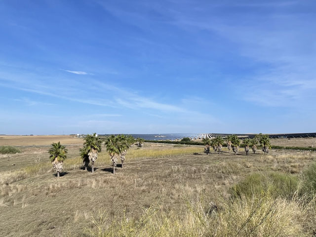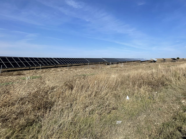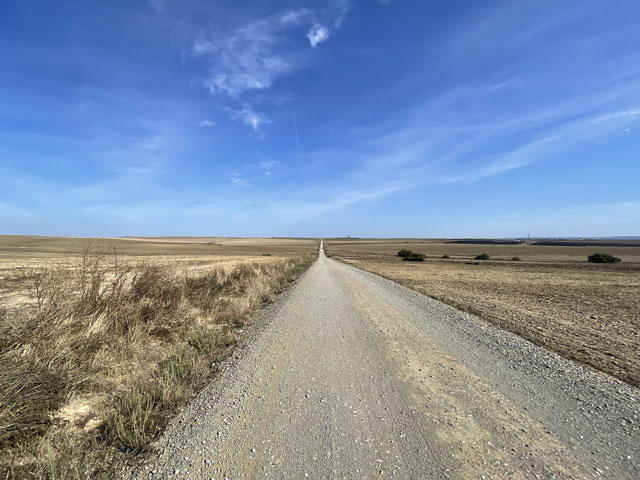 Nach dem Überqueren einer Eisenbahnlinie stößt die Straße auf die N-431, auf der 600 m nach rechts der kleine Ort La Ribera liegt, der eine Gaststätte hat. Da es inzwischen Mittagszeit war und auch im weiteren Verlauf der Straße keine Gaststätte kommt, habe ich den kleinen Umweg gemacht und bin in La Ribera eingekehrt - wie immer zu Tomaten-Toast, Bier und Kaffee, alles zusammen für 4,70 €. Hier ist die Welt noch in Ordnung. Zum Sattwerden hat mir das völlig gereicht. Zurück zur ursprünglich gelaufenen Straße und weiter in deren Verlauf ging es über die Autobahn. Bald danach macht die Straße einen Knick nach rechts und links zweigt eine schmale, kaum genutzte Straße ab, auf welcher der Jakobsweg verläuft. Da ging es zunächst zwischen zwei riesigen Solarfeldern hindurch. Das waren die ersten großen Solaranlagen, die ich hier in Spanien zu sehen bekommen habe. Ich habe mich schon so oft geärgert, dass wir auf jedem dunklen Hinterhof Balkonkraftwerke installieren sollen und hier die brennende Sonne ungenutzt bleibt.