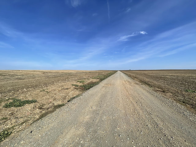 Hinter den Solaranlagen gab es für den Rest des Weges links und rechts nur noch abgeerntete Felder, bei denen die Stoppeln aus der Erde ragten. Ich habe vor dem Ziel einen Abzweig des Jakobsweges übersehen und bin am Südrand von Trigueros an der N-435a rausgekommen, kurz bevor die in den Ort hineinführende Straße abzweigt. Das traf sich gut, weil dort gegenüber der Tankstelle der vermutlich einzige große Supermarkt („Dia“) liegt. Da dieser keine Mittagspause macht, konnte ich mir was für ein Picknick im angrenzenden Park kaufen.