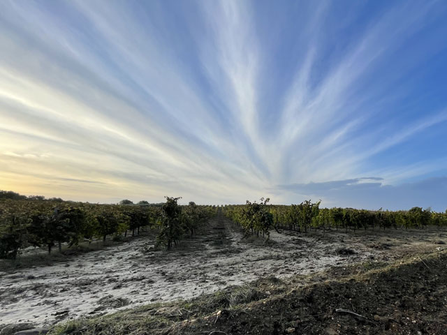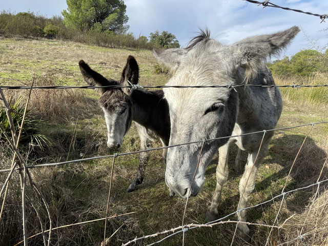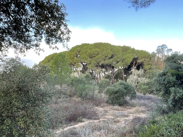 Zwischen den Plantagen fanden sich auch Wein-„berge“, die jetzt natürlich gänzlich abgeerntet sind, aber in allen herbstlichen Farben leuchten. Am Morgen konnte man das alles noch bei Sonnenschein genießen, aber dann zogen Wolken auf und es begann zu tröpfeln. Nun ging es aber lange Zeit durch einen lichten Pinienwald, in dem nicht viel vom Regen zu spüren war, aber doch so viel, dass ich das Regencape überziehen musste.