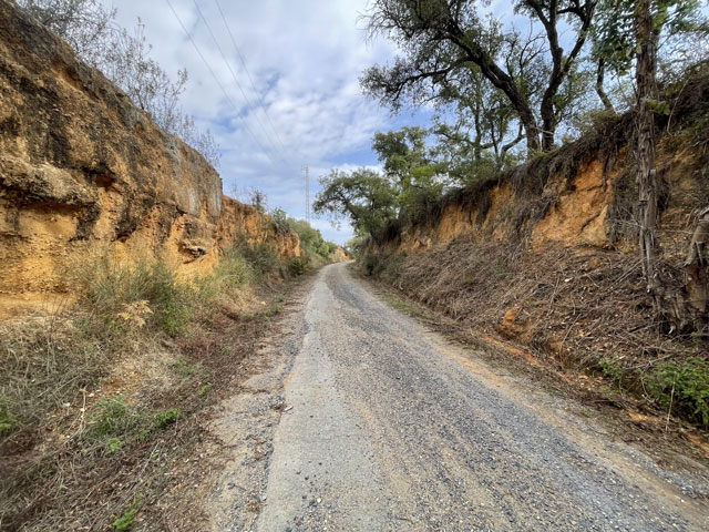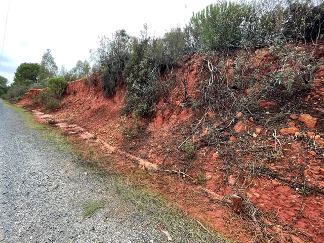 Hinter der Straßenkreuzung ging es weiter durch den Pinienwald. Jetzt kreuzten da aber viele Wege, die teils als Brandschneisen und teils als Zufahrt zu Kiesgruben dienen. Hier bekam ich schon mal einen Vor-geschmack auf das, was mich in und hinter Minas de Riotinto erwartet. Da wird nämlich seit dem 19. Jahrhundert Eisen und Kupfer abgebaut, was hier den Boden mitunter tiefrot färbt und damit auch die Flüsse, die sich durch das Gestein gefressen haben. Der Rio Tinto, den ich noch zu sehen bekomme, hat nicht umsonst diesen Namen bekommen.