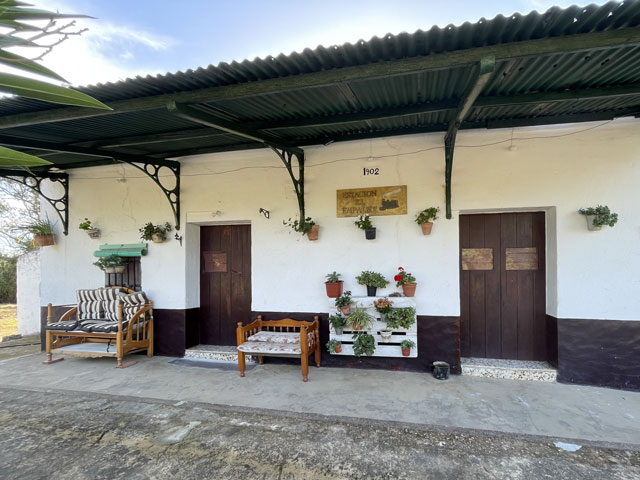 Juan Carlo ließ es sich nicht ausreden, mich wieder in die Stadt zu fahren, etwa dahin, wo ich gestern aufgelesen wurde. Der gelaufene Weg soll doch keine Lücken aufweisen … Von dort, wo er mich abgesetzt hat, waren es nur wenige Meter bis zum Camino, der fast bis zum Ziel auf einem alten Bahndamm verläuft. Im ersten Teil ist der sogar asphaltiert, später nur glattgewalzt und dann auch auf langen Strecken lediglich eine Schotterpiste. Mitunter war der Weg auch von Forstmaschinen zerfurcht, weshalb man da um diverse Pfützen tänzeln musste. Aber nicht nur der Belag des Weges, sondern auch das leicht hügelige Umland war sehr abwechslungsreich. Mal war alles mit kniehohem, trockenem Gras bewachsen, dann gab es jüngst abgeholzte Flächen, auf denen aber schon wieder Bäume und Sträucher gepflanzt wurden oder stehengeblieben sind. Später kamen noch Viehweiden dazu, bei denen man immer ganz brav die Tore wieder hinter sich schließen musste. Und schließlich ging es durch endlose Zitronen- und Orangenplantagen. Sehr vereinzelt gab es am Weg auch Fincas mit überwiegend sehr ordentlichen Häusern. Ruinen waren kaum mal zu sehen. Wie zum Beweis, dass man auf einem Bahndamm läuft, gab es in der Nähe einer Straßenkreuzung einen ehemaligen Bahnhof und auch mal eine ehemalige Verladeeinrichtung für Erz.
