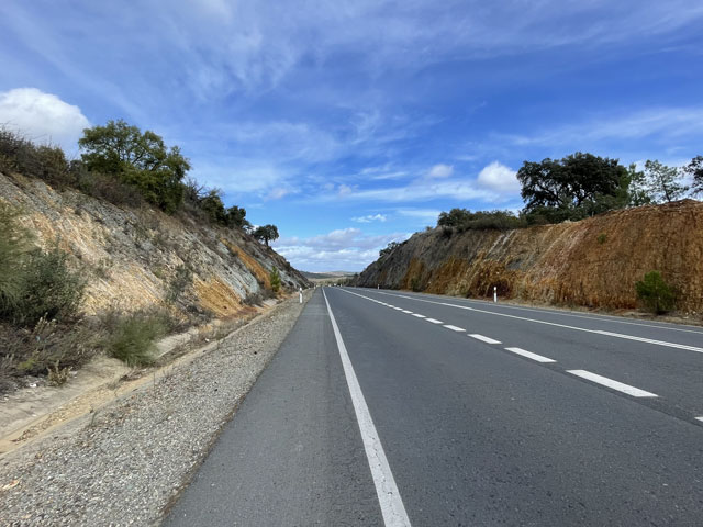 In El Campillo hatte ich übrigens vor ein paar Tagen im Rathaus bzgl. einer Herberge angefragt und die Antwort bekommen, dass diese zwar geschlossen sei, man mir aber einen Schlafplatz in einem Pavillon herrichten würde, wenn ich mich einen Tag vorher melde. Da sich zwischenzeitlich herausstellte, dass es auch in Minas de Riotinto eine Unterkunft gibt und der Ort günstiger gelegen ist, habe ich gestern noch in El Campillo abgesagt. Um den Ort aber nicht völlig zu ignorieren, bin ich wenigstens in einer Bar an der Fernstraße A-461 eingekehrt, um mich zu erfrischen. Um nicht die paar Meter zum Camino zurücklaufen zu müssen, bin ich für die verbleibenden zwei Kilometer bis Minas de Riotinto gleich an der Straße geblieben, was aber keine so gute Idee war, weil ich immer vom schmalen Randstreifen ins Bankett treten musste, wenn ein Auto dicht an der Begrenzungslinie fahrend vorbeirauschte.