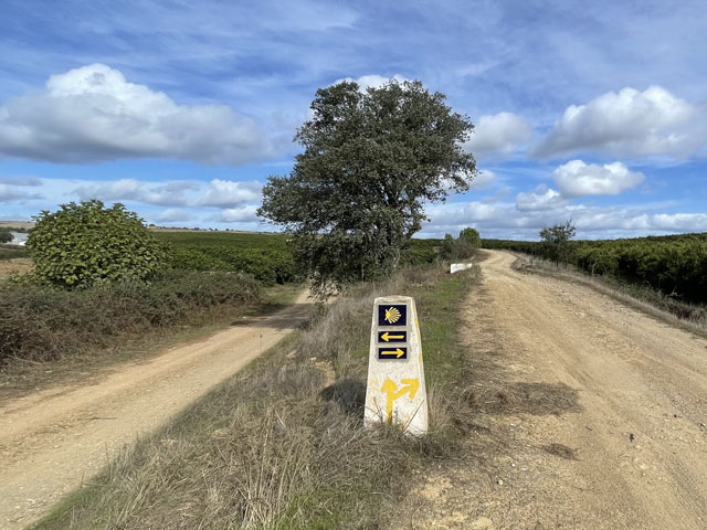 Kurz vor El Campillo, dem einzigen Ort an der Strecke, verlässt der Camino den Bahndamm und damit auch den Radweg „Eurovelo 1“, mit dem er die ganze Zeit identisch verlief. Lt. Karte geht es rechts ab und im Zickzack durch eine Orangenplantage. Von zwei Arbeitern, die dort zwischen den Bäumen gemäht haben, wollte ich wissen, ob denn auch wirklich am anderen Ende der Plantage ein Tor offen ist. Die sahen das aber aus Aufforderung an, mir einen viel besseren Weg zu erklären und ihre Hände zeigten nicht nach El Campillo, sondern in entgegengesetzte Richtung. Da ich ja schon wiederholt erlebt habe, dass die Spanier einem gern mal was erklären wollen, was die selbst nicht wissen, bin ich unbeirrt nach meiner Karte weitergelaufen, bis mich deren Pfeifen, Rufen und Winken veranlasste, klein beizugeben und dahin abzubiegen, wohin sie zeigten. Um es kurz zu fassen: ich bin dem Labyrinth, in dem ich mich nun befand, wieder entronnen und an der Straße angekommen habe ich gesehen, wie gut und schnell ich dorthin gelangt wäre, wenn ich stur geblieben wäre.