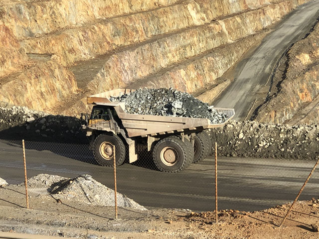 Auf der Karte war zu sehen, dass es nach etwa tausend Metern an besagter Straße einen Parkplatz mit Aussichtspunkt gibt. Bis dort wollte ich mich wenigstens vorkämpfen und den vermutlich grandiosen Blick in die Minen genießen. Dass ich dies jetzt schreiben kann, beweist, dass ich es überlebt habe. Es war aber wirklich kein Spaß. Der Randstreifen der Straße ist vielleicht zwanzig Zentimeter breit und dann kommt die Leitplanke, hinter der es bergab geht. Beim normalen Gehen ragt man also schon mit dem Rucksack auf die Fahrbahn. Deshalb habe ich mich zumindest bei größeren Fahrzeugen seitlich hingestellt, den Rucksack über die Leitplanke ragen lassen und gehofft, dass mir keiner über die Füße fährt. Aus Angst, dass das jemand nachmacht, müsste ich eigentlich verschweigen, wie überwältigend der Blick in die riesige Grube „Cerro Colorado“ auf der rechten Seite (östlich der Straße) ist. Die ist bis zu 230 Meter tief und über die Rampen, welche die Terrassen miteinander verbinden, fahren Fahrzeuge bis ganz nach unten. Abgebaut wird aber derzeit auf etwa 80 Meter Tiefe. Die riesigen Dumper, die im Minutenabstand zum Beladen da runter fahren, sehen unten angekommen wie sehr kleine Spielzeugautos aus. Voll beladen kämpfen sie sich anschließend die Rampe hoch, um dann je nach Qualität des geladenen Materials zur Halde oder ins Werk zu fahren. Auch das ist ein Schauspiel, dem ich lange zuschauen könnte. Da es aber schon fast um fünf war und ich noch ins Minenmuseum wollte, das um sieben schließt, musste ich mich schließlich losreißen und den Rückweg antreten. Die vielen Bilder, die ich unterwegs und vom Aussichtspunkt aus gemacht habe, vermitteln hoffentlich wenigstens ansatzweise den grandiosen Eindruck, den die Mine auf mich gemacht hat.