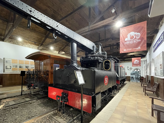 Der zweite Teil des Museums liegt mitten in der Stadt auf einem Hügel. Dort wird in verschiedenen Sälen die Geologie des Ortes erklärt und was man hier aus der Erde holt. Am Aussichtspunkt war schon zu lesen, dass dies allein aus der Mine „Cerro Colorado“ u. a. jährlich 6.700 kg Gold und 140.000 kg Silber sind! Dafür werden jährlich 4,5 Millionen Tonnen Gestein bewegt. Im Museum findet man zu allen gefundenen Mineralien auch Ausstellungsstücke, die in den tollsten Farben funkeln und mitunter ganz bizarre Formen aufweisen. Beim nächsten Besuch im Naturkundemuseum muss ich mal darauf achten, ob dort unter den Mineralien auch welche vom Rio Tinto sind. Sicher. Im hiesigen Museum wird außerdem anhand von Modellen gezeigt, wie sich die Form und Größe der Gruben, aber auch der angrenzenden Siedlungen über die Zeit geändert hat. Zudem sind natürlich auch alle möglichen Gerätschaften zu bewundern. Eine ganze Abteilung beschäftigt sich mit der hiesigen Erzgewinnung zur Zeit der Römer und unter der Erde kann man den Stollen eines römischen Bergwerkes besichtigen. In einer angrenzenden Halle gibt es zudem zwei Lokomotiven und einen noblen Personenwagen der Eisenbahn zu sehen, welche die Engländer vor 150 Jahren entlang des Rio Tinto von hier bis nach Huelva gebaut haben.