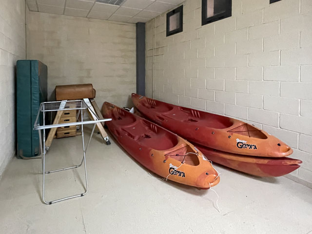 Kurz vor sieben wurde ich als letzter aus dem Museum gekehrt. Im Dunkeln bin ich dann zu meinem heutigen Quartier, dem Sportzentrum (Polideportivo) von Minas de Riotinto. Dort soll man sich an der Rezeption melden. Die Tür der Halle stand offen, weil drinnen reichlich Betrieb war, doch an der Rezeption war leider niemand. Aber noch bevor ich die Telefonnummer rausgesucht hatte, kam ein junger Mann, der meine Personalien aufgenommen und mich zu meinem Zimmer oben auf der Tribüne der Halle geführt hat. Das ist wieder ein Abstellraum, in dem aber eine Luftmatratze und zwei aufeinander gestapelte Trainingsmatten liegen und noch zwei einfache Campingbetten bereitstehen. Den Raum teile ich mir mit zwei Böcken und drei Kajaks, die hier ihre Ruhestätte gefunden haben. Da es sogar ein Heizgerät gibt, sollte es hier auszuhalten sein. Toiletten gibt es hier oben auf der Tribüne, Duschen unten zwischen den Umkleidekabinen. Ab zehn ist die Halle geschlossen, dann ist alles meins.