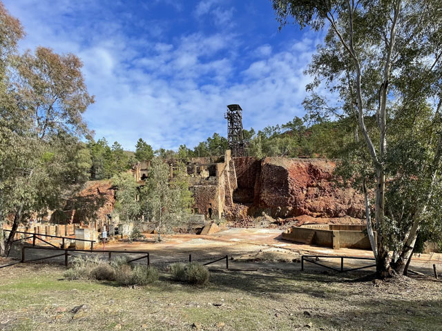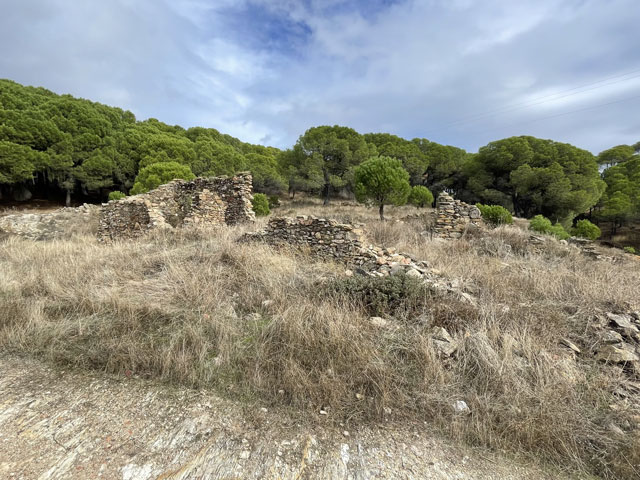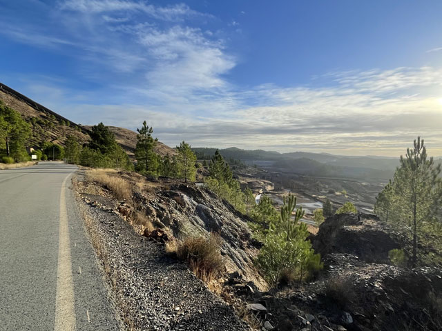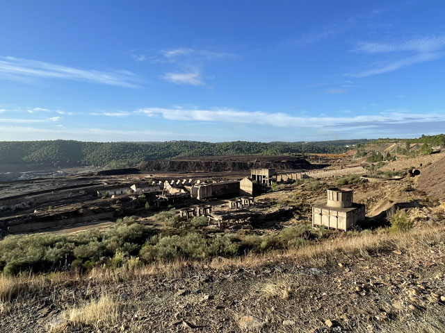 Auf dem weiteren Weg, der zunächst durch regelrechte Slums und dann durch schönen Pinienwald führte, waren immer wieder Reste früheren Bergbaus zu sehen. Der Weg kreuzte außerdem mehrmals einen Bach, der so aussah, wie ich den Rio Tinto von Bildern kenne: eine rote Brühe. Dann führte der Weg durch eine verfallene Bergbausiedlung, in der sich aber ein paar Leute niedergelassen haben. Wovon die hier leben und wie die ihren Tag verbringen, möchte ich gern wissen. Gesehen habe ich keinen Menschen, dafür umso mehr Hunde, die zwar gebellt haben, aber friedlich blieben. Zwei große sind mir ein Stück nachgelaufen, aber vermutlich nur aus Neugier, denn sie haben respektvoll Abstand gehalten.