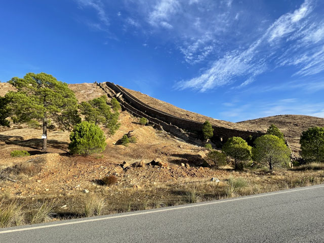 Der Weg führte von der A-476 weg und einen kleinen Abhang hinab zu einer kleinen, kaum befahrene Straße, die in einem Bogen nach Nerva führt. Hinter einer Kurve sehe ich plötzlich am Berghang die Chinesische Mauer. Zumindest sieht das Gebilde, dass sich von der Straße bis zur Kuppe hinzieht, so aus. Und beim Näherkommen, sieht man dann noch alles doppelt, denn es ziehen sich zwei „Chinesische Mauern“ den Berg hoch. So ganz erschließt sich für mich nicht der Sinn. Aber da auf der anderen Straßenseite Reste von Industrieanlagen und Gleise zu sehen sind, vermute ich, dass in den „Chinesischen Mauern“ Material, das im oder hinter dem Berg gefördert wurde, nach unten zu den Anlagen transportiert und dort weiter verarbeitet wurde. Da einige der Ruinen aus Beton sind, kann das alles noch nicht so richtig alt sein. Leider war nirgendwo ein Schild zu sehen, auf dem dazu mal was erklärt wird.