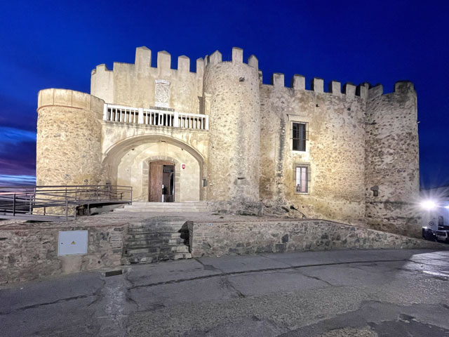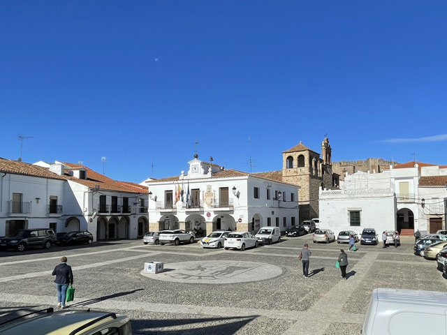 Wie in Fuentes de León habe ich mir auch hier im Rathaus einen Stempel geholt. Hier direkt am Camino weiß man im Rathaus sofort, worum es geht, wenn man wie bei Robert Lemke die fürs Stempeln typische Handbewegung macht. Den Weg zur Burg habe ich mir gespart, da die am Montag ganz sicher geschlossen ist. Zur Kirche bin ich hochgelaufen, aber die war natürlich zu. Da auch die einzige Bar am zentralen Platz (Plaza de España) geschlossen war, habe ich jemand nach einer Bar gefragt und bin zu einem Haus geschickt worden, an dem ich auf dem Weg zur Kirche schon mal vorbeigelaufen bin, das „Hogar del Pensionistas“ (Heim der Rentner). Da war ich richtig und da gab es für die alten Herrschaften am Tresen auch mein Lieblingsgetränk. Allerdings musste man alles selbst bezahlen, die Rentenkasse gibt bei den Getränken nicht mal was dazu.