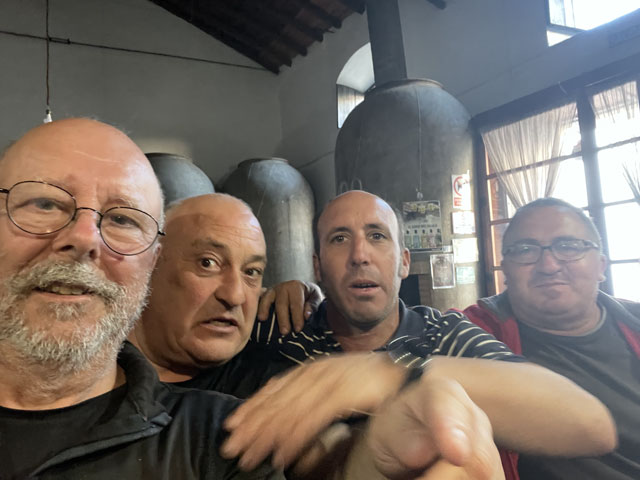 Der Kneiper hinterm Tresen sagte auf meine Frage, ob er den Schlüssel zur Herberge hat, dass er nichts davon wisse. Und die drei Männer am Tresen stürzten sich gleich verbal auf mich und meinten, dass ich weiterlaufen müsse. Ob mich denn nicht die Nachricht erreicht habe, dass die Herberge kalt und geschlossen ist. Irgendwann habe ich gemerkt, dass die mich auf den Arm nehmen und es entspann sich mittels Übersetzungsprogramm eine lustige Plauderei. Einer der drei, der angeblich erst 38 war, alberte rum und schmetterte Arien, die beiden anderen stachelten ihn immer wieder an. Ich habe Fotos gemacht und seine Singerei gefilmt. Nun war ich damit an der Reihe, die drei auf den Arm zu nehmen und ich habe ihnen erzählt, dass die Aufnahmen für das deutsche Fernsehen seien, aber vielleicht auch in Amerika ausgestrahlt werden. So nahm die Blödelei weiter ihren Lauf. Vom hiesigen Wein haben sie mir auch zu trinken gegeben und noch ein zweites Bier spendiert. Als der Wirt kleine Spieße mit Gurken und Peperoni auf den Tisch stellte, haben sie gelauert, was für ein Gesicht ich beim Essen mache. Aber so sonderlich scharf waren die Dinger gar nicht.