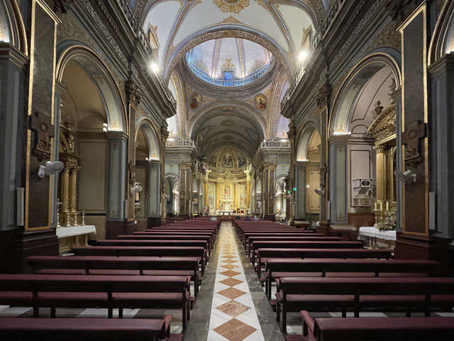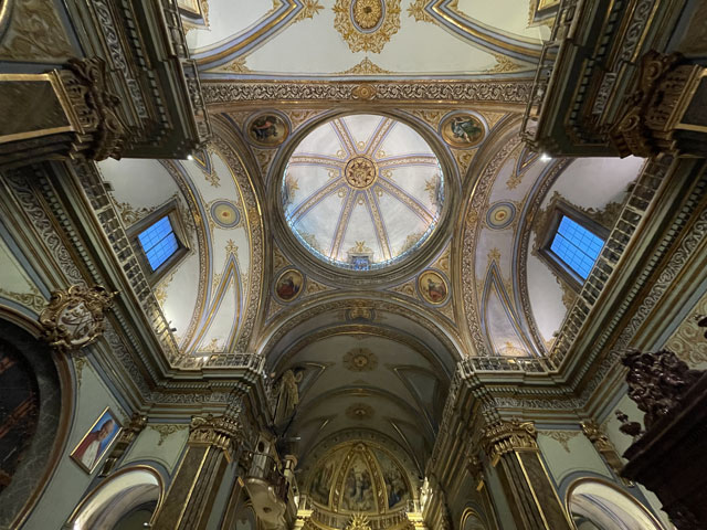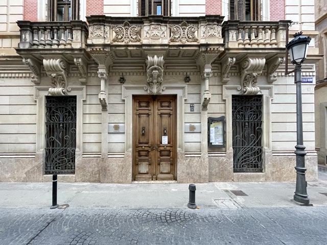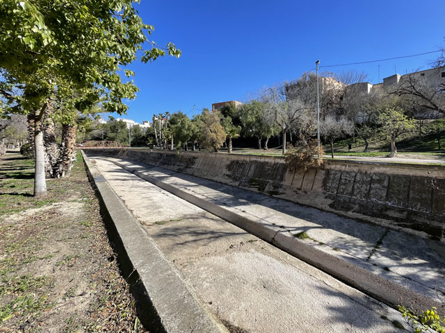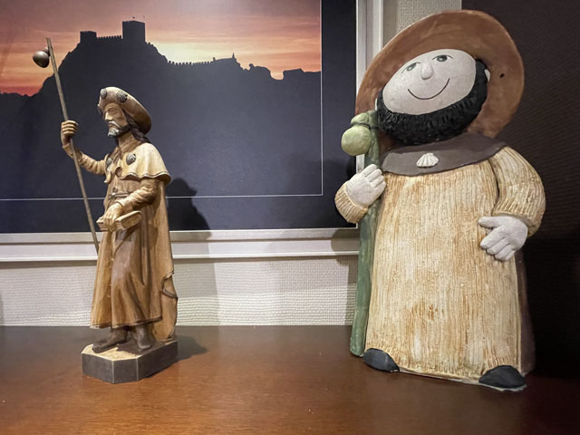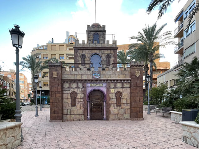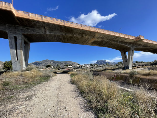 Als ich aus dem Hotel raus bin, war es noch stockfinster und dabei blieb es auch, bis ich im Nachbarort Novelda angekommen bin. Die Orte gehen ineinander über, weshalb die Straße mit einem Fußweg versehen ist. Sonst wäre es im einsetzenden Berufsverkehr nicht möglich gewesen, dort im Dunkeln zu laufen. In Novelda landet man zunächst in einem Gewerbegebiet mit mehreren großen Firmen und einem Lager der Supermarktkette „Hiperber“, der ich hier erstmals begegnet bin und die mir recht preiswert erscheint. Vor dem Lagerhaus war um diese Zeit schon ordentlich Betrieb - viele LKW wurden ein- und ausgeladen. Im Ort bin ich dem Wegweiser zur Kirche und zum Rathaus gefolgt, in der Hoffnung, dort irgendwo einen Stempel abzufassen. Gestern hatte ich übrigens das seltene Glück, in Monforte bei der Polizei einen zu bekommen, denn im Hotel gab’s keinen und das Rathaus war schon zu. Hier in Novelda war zu meiner Überraschung kurz nach acht das Rathaus schon in Betrieb. Die Dame, die ich da angesprochen habe, hat mich in die gegenüber liegende Touristeninfo geschickt, mir aber durch geschickte Zeichensprache zu verstehen gegeben, dass ich zurückkommen soll, wenn ich dort keinen Erfolg habe. Da die Touristeninfo selbst noch nicht besetzt war, habe ich in einem angrenzenden Büro gefragt und drei Damen schwirrten aus, um den Stempel zu suchen, der aber vermutlich im Schreibtisch eingeschlossen war. Ich bin also wieder ins Rathaus, wo mir die nette Dame einen Kollegen ran geholt hat, der über den erbeteten Stempel verfügte. Wenn man kurz nach acht schon auf fünf nette, hilfsbereite Leute getroffen ist, kann es eigentlich nur ein guter Tag werden. Der Herr im Rathaus hat mich da noch die Deko fotografieren lassen und mir sogar angeboten, die Toilette zu benutzen. Die Kirche war übrigens auch schon auf. Da gab innen viel goldene Bemalung. Alle Säulen und Gewölberippen waren vergoldet, aber irgendwie sah das nicht aufdringlich aus. An Altären mangelte es auch nicht. Gleich am ersten bin ich auf den von mir verehrten St. Rochus gestoßen - jenen, der immer einen Hund bei sich hat und auf einen vermeintlichen Hundebiss im Oberschenkel zeigt, was aber eine Pestnarbe sein soll. Gleich um die Ecke hat der Ort ein „Museum der Moderne“ zu bieten, das sich offenbar mit dem Jugendstil befasst, denn überall am Haus fanden sich entsprechende Verzierungen. Hinter dem Ort führte der Weg zum Riu Vinalopó, der momentan nur ein kleines Bächlein in einem breiten, ausgetrockneten Flussbett ist. Der Camino verläuft einige Kilometer in diesem Flussbett, ist aber in der Karte gestrichelt eingezeichnet, was heißt, dass der nicht immer benutzbar ist. Bald hinter Novelda kam links auf einer Bergkuppe eine Kirche ins Blickfeld, die in Kleckerburg-Architektur ausgeführt ist und nicht zufällig Ähnlichkeit mit Gaudis „Sagrada Familia“ in Barcelona hat. Diese hier, die der Hl. Maria Magdalena gewidmet ist, hat ein Schüler Gaudis geschaffen. Da ich vor ein paar Wochen die Sagrada zu sehen bekommen habe, ist mein Bedarf an Gaudi-Bauwerken für den Rest meines Lebens gedeckt. Deshalb habe ich die Zeit und Kraft gespart, zur Kirche hochzusteigen. Im Rathaus hatte ich bereits ein großes Modell gefunden und fotografiert, so dass ich trotzdem mit Bildern aufwarten kann. Beim Modell ist allerdings nicht wie beim Original ein Turm bandagiert. Die ausgefallene Architektur ist offenbar nicht sonderlich langlebig. Abgesehen von wenigen Joggern und Radfahrern ist mir auf dem Weg entlang des Baches niemand begegnet. Noch vor der Kirche auf dem Berg war mal eine Furt zu passieren, was aber Dank der großen Steinquader im Wasser kein Problem war. Kurz vor Elda, nachdem eine Schnellzugtrasse und die Regionalbahn unterquert waren, führte der Weg aber zu einer Furt, die mal großzügig betoniert, aber dann zur Hälfte vom Wasser weggerissen wurde. Da war ein Passieren nicht so leicht möglich. Bei der Suche nach Stöckern, mit denen man sich abstützen kann, bin ich dann auf Pfeile gestoßen, die anzeigen, dass man hier nicht den Bach queren, sondern weiterlaufen soll. Diesem Hinweis bin ich gern gefolgt, obwohl der mit einem großen Umweg verbunden war. Beim Durchqueren von Elda habe ich nichts Bemerkenswertes entdeckt, aber eine Bar gefunden, in der es leckere Tortillas (spanische Omelett) gab. In Elda trifft der Weg wieder auf dem Riu Vinalopó, der als winziges Rinnsal in einem breiten, betonierten Flussbett fließt. Diesem Flussbett folgt der Weg auf der linken Seite in Richtung Norden, wobei es durch ausgedehnte Parkanlagen und vorbei an einem noch in Betrieb befindlichen Taubenturm geht. Info-Tafeln klären auf, dass hier schon zur Römerzeit eine Straße (Via Augusta) verlief. Hinter der Stadt bleibt der Weg weiter dem Fluss treu und windet sich mit ihm durch die Berge. Er ist allerdings an vielen Stellen gestrichelt eingezeichnet, also nicht immer benutzbar. Es geht vorbei an der Ruine eines Elektrizitätswerkes, unter der Straße hindurch und in einem engen Abschnitt des Tals vorbei an einer 300 Jahre alten Staumauer. Solche Sehenswürdigkeiten sind mit Infotafeln versehen, die aber leider nur auf Spanisch sind. Der Weg durch die Berge ist wirklich schön und Dank des Flusses ziemlich eben. Momentan ist die Vegetation nur leider recht grau, im Frühjahr wird es da durch Ginster und Co. sicher etwas farbenfreudiger aussehen. Hinter dem theoretischen Stausee kreuzt die Regionalbahnlinie den Weg im Tal, der sich nun ihr anschließt. Bahn und Weg verlaufen ab hier schnurgerade auf Sax zu. Im ersten Abschnitt hat man dafür einen halben Berg abgetragen, wie man an der hell leuchtenden Felswand erkennen kann. Der Weg führt teils durch das Grün zwischen der Bahn und dem jetzt parallel dazu laufenden Fluss, teilweise auch direkt neben oder im Schotterbett der Bahn. Die Burg über der Stadt, auf die man zuläuft, wird immer imposanter. Sie thront auf dem Kamm eines Felsens, der sich „aus dem Nichts“ erhebt