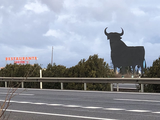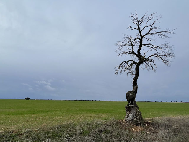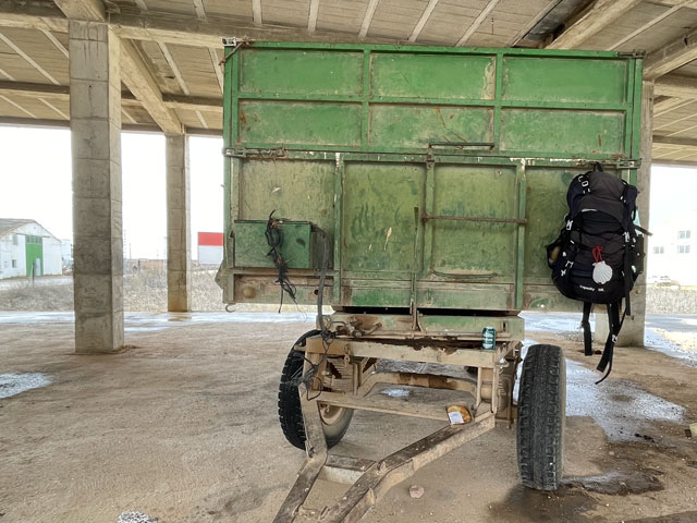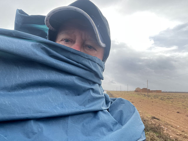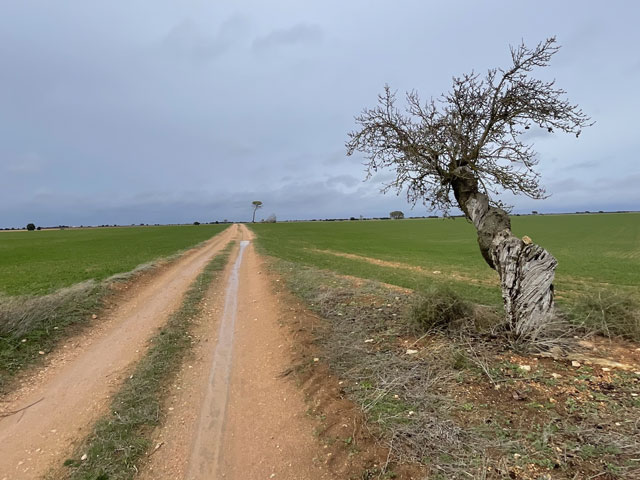 Ich bin trotzdem um sechs losgelaufen, damit ich noch im Hellen in La Roda ankomme. In Albacete im Dunkeln zu starten war kein Problem, denn da waren alle Straßen gut beleuchtet. Ich habe fast eine Stunde gebraucht, um aus der Stadt raus und durch das angrenzende Gewerbegebiet zu kommen. Bis dahin gab es überall Fußwege und damit kein Problem, im Dunkeln zu laufen. Hinter dem Gewerbegebet mündet die Hauptstraße in die Autobahn A 31. Auf der daneben verlaufenden Service-Straße hatte ich vor zu laufen, zumindest solange es dunkel ist. Wegen der schlechten Wetterprognose (100% Regen) wollte ich weder den südlich parallel zur Autobahn verlaufenden Camino de Levante, noch denn nördlich verlaufenden Camino del Sureste nehmen. Beide treffen sich in La Gineta, dem einzigen Ort auf der Strecke und verlaufen dann gemeinsam nördlich der Autobahn, wieder ein paar hundert Meter von dieser entfernt. Da, wo die Straße in die Autobahn mündet, habe ich im Dunkeln irgendwie den Zugang zur Service-Straße verpasst, wahrscheinlich war der dort, wo ich eine riesige Pfütze umrunden musste. Der asphaltierte Weg hinter den Leitplanke, den ich für die Service-Straße gehalten habe, endete an der nächsten Brücke. Da musste ich über die Leitplanke klettern und auf dem Standstreifen der Autobahn weiterlaufen, was eigentlich mit der Taschenlampe in der Hand kein Problem und auch nicht sonderlich gefährlich ist - aber selbstverständlich verboten. Als es dann heller wurde, habe ich gesehen, dass unmittelbar hinter dem Viehzaun entlang der Autobahn die Service-Straße verläuft und dass diese ganz gut befestigt ist. Aber es war kein Hinkommen. Es fand sich keine Lücke und nirgendwo eine Tür im Zaun. So musste ich wohl oder übel am Straßenrand weiterlaufen. Als auf der anderen Seite der Autobahn ein Polizeiauto an mir vorbeifuhr, war mir schon klar, was folgen wird und ich bin vorsorglich über die Leitplanke runter ins Bankett, auf dem man hier auch ganz gut laufen konnte. Wie zu erwarten haben die Polizisten an der nächsten Abfahrt gedreht, sind mir entgegengekommen und haben neben mir gehalten. Ein Polizist stieg aus und kam zu mir runter ins Bankett. Einer von der „Guardia Civil / Trafico“, also Verkehrsüberwachung und damit für Missetäter wie mich zuständig. Der sprach sogar gut Englisch und so konnte ich ihm erklären, dass ich auf dem Weg nach Santiago bin und furchtbar gern die Service-Straße nehmen würde, aber nicht hinkomme. Statt zu meckern hat er versucht, den Zaun anzuheben, damit ich darunter hindurch kriechen kann, aber das ging natürlich nicht. Ich habe gefragt, ob ich denn nicht bis zur nächsten, nur einen Kilometer entfernten Abfahrt im Bankett weiterlaufen darf, aber das konnte er nicht erlauben. Ich solle mich ins Auto setzen und sie würden mich dort hinfahren. Da ich dann mit dem Einwand kam, dass ich auf dem Pilgerweg bin und alles laufen und nicht zwischendurch fahren will, kam dem offenbar pilgerkundigen Polizisten die Idee, mit mir bis zur zurückliegenden Autobahnauffahrt zu fahren, dort zu wenden und auf der Service-Straße genau bis zu der Stelle zu fahren, wo sie mich aufgegabelt haben, nur halt jenseits des Zauns. Eine guter Vorschlag, auf den ich sofort eingegangen bin. So bin ich zu einer kostenfreien Fahrt im Polizeiauto gekommen, ohne einem Meter Fußweg zu überspringen und dadurch vielleicht den Ablass zu gefährden. Statt einer Strafe gab es zum Abschied einen Handschlag und ein „Buen Camino“. Ich war bereits um halb elf in La Gineta, auf halbem Wege, und damit eher als geplant. Ich habe mich in einem Supermarkt am Ortseingang („Charter“, eine Tochter von „Consum“) mit dem Nötigsten für ein Picknick versorgt und dieses auf einer überdachten Fläche mit diversen landwirtschaftlichen Geräten zelebriert - ganz konkret auf der Deichsel eines Traktoranhängers. Dort zu sitzen war eine Wohltat, denn den ganzen Tag gab es entlang des Weges keine brauchbare Sitzgelegenheit. Da ich so gut in der Zeit lag, bin ich mitten im Ort nochmal in eine Bar eingekehrt, um einen Kaffee zu trinken. Weil die dort in einer Vitrine auf dem Tresen verschiedene Leckereien hatten, ist daraus ein längerer Aufenthalt geworden. Ich habe mir einen Teller Rührei mit Pilzen und Bohnen kommen lassen, dazu einen Tomatensalat mit sehr reichlich Knoblauch. Als ich mich gegen zwölf wieder auf den Weg machte, hatte es gerade zu regnen angefangen. Aber ich will ja nicht meckern. Wenn es bei 100% Regenwahrscheinlichkeit erst mittags nass wird, ist das ok. Obwohl es nun ganz danach aussah, dass es sich einregnet, habe ich den in der Karte eingezeichneten Weg genommen, statt weiter neben der Autobahn her zu laufen. Viel mehr gab es da nicht zu sehen, aber wenigstens entfiel der Lärm der Autobahn. Hier ist absolut flaches Land. Kein Hügel, geschweige denn Berg erhebt sich hier aus der Ebene. Der Regen ließ zwar nach einer Weile etwas nach, dafür gab es kleine Hagelkörner von vorn direkt ins Gesicht. Das war nicht schön, denn es fühlte sich an, als wäre man in eine Sandstrahlanlage gekommen. Der permanente Wind hat wieder mit dem Regenponcho getanzt, bis mir dieser wie ein Schal um den Hals hing und der Rest des Pilgers nebst Gepäck auf dem Rücken schutzlos dem Regen ausgesetzt war. Es ging tatsächlich sehr beschwerlich voran. Auf zwei Schritte vorwärts folgte einer rückwärts. Und alle hundert Meter habe ich angehalten und mich gedreht, um Luft zu schnappen. Der stets von vorne kommende Wind hat einem die Lunge vollgepustet, aber nichts wieder rausgelassen, so dass sich schnell Atemnot und Sauerstoffmangel einstellten. Und der Rücken tat mir weh, was sicher nicht dem Gepäck geschuldet war, denn das wog nicht mehr als sonst. Vermutlich war das tagelange Gegen-den-Wind-Stemmen Schuld daran. Überhaupt gab es kurz vor Erreichen des Ziels kaum ein Körperteil, das nicht wehtat. Aber ich habe es trotzdem nicht bereut, die Etappe nach La Roda an meine eigentlich nu
