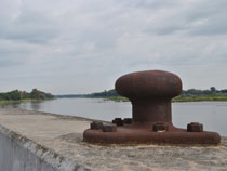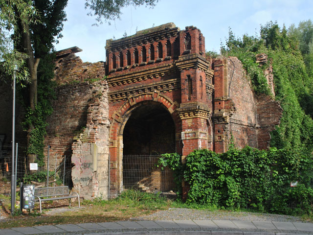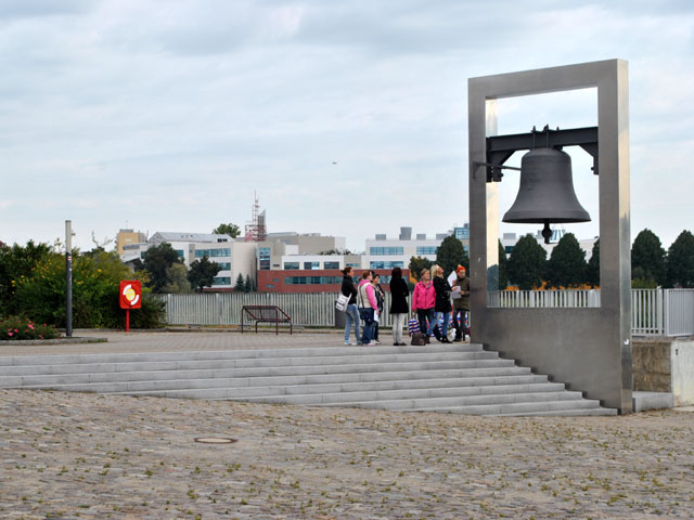 An der Ufermauer wende man sich also nach links und laufe am Wasser gen Norden, d. h. stromabwärts. Vorbei geht es an der Friedensglocke, die 1953 von der Ost-CDU gestiftet wurde und seit 2011 ihren jetzigen Standort hat. |