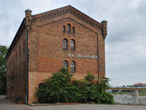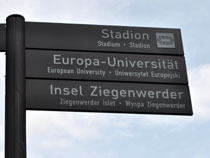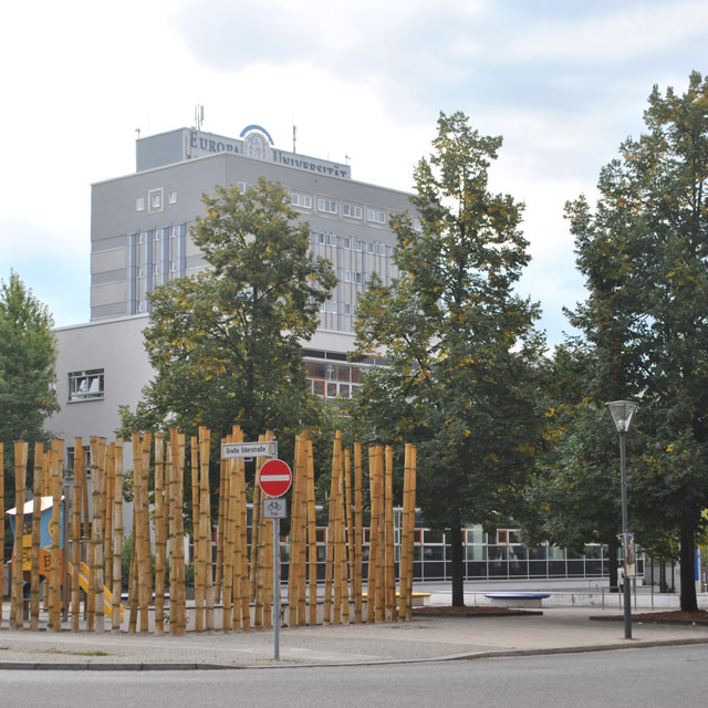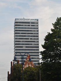 Im Hintergrund ist das einst als Bettenhaus der Bezirksparteischule Frankfurt (Oder) der SED erbaute Studentenwohnheim der Universität zu sehen. Die dort untergebrachten Studenten haben einen grandiosen Blick auf die Stadt und die Ufer der Oder.