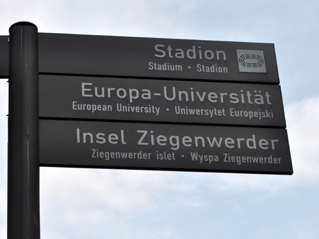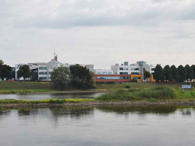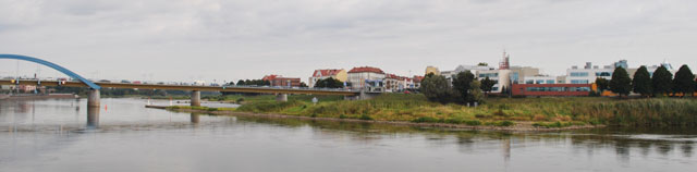 Der Blick über die Oder und damit über die Grenze fällt auf den modernen Bau des Collegium Polonicum, den polnischen Ableger der Europa-Universität Viadrina.