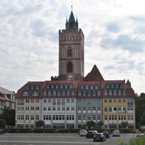 Da der Heilige Jakobus nach Nordosten schaut, kann man getrost in diese Richtung laufen - vorbei am lesenden Mädchen vor dem Buchladen und durch die Bischofsstraße zum Holzmarkt am Oder-Ufer. (Wer etwas gegen Bischöfe hat, kann auch die parallele Regierungsstraße benutzen.)