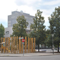 Die beidseitig beinamputierte Dame (oben rechts) soll die Muse darstellen und macht Reklame für das nahe Haus der Künste.