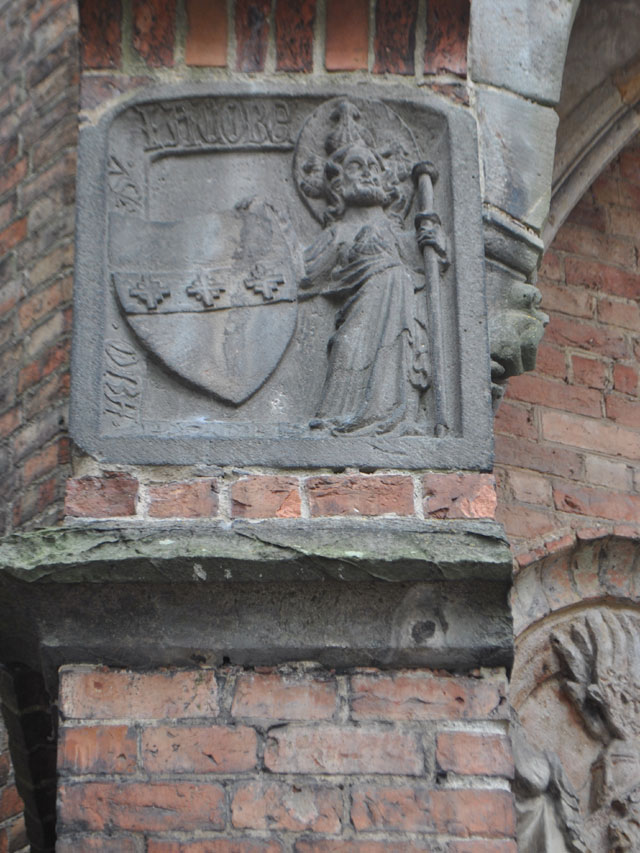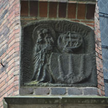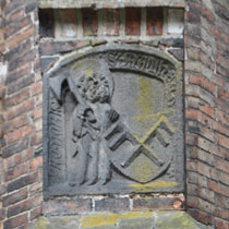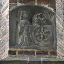 Das Relief am linken Pfeiler stellt zweifelsfrei den Heiligen Jakobus dar - unschwer an der umgehängten Jakobsmuschel und dem nebenstehenden „Iakob“ zu erkennen. Um den Heiligen ganz sicher identifizieren zu können, hat der Steinmetz ihn zusätzlich mit einem Heiligenschein versehen, der mit weiteren Jakobsmuscheln besetzt ist.