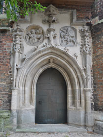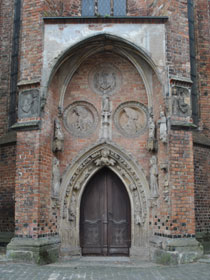 Die Kirchenportale weisen einen reichhaltigen figürlichen Schmuck auf. Am Nordportal, das zum angrenzenden Parkplatz zeigt, befinden sich über der Tür drei große kreisrunde Plaketten mit Heiligendarstellungen. Und auch die Pfeiler beidseits des Portals sind mit Reliefs geschmückt.