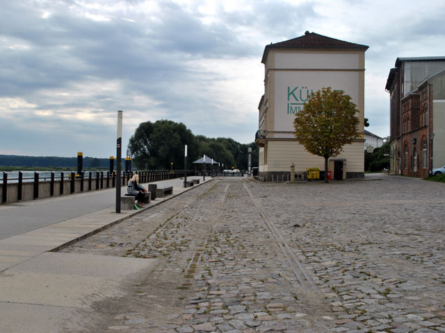 Auf der Uferstraße, in der noch alte Eisenbahngleise auszumachen sind, stößt man immer wieder auf alte Kräne und sonstige Hafen-Utensilien sowie auf schön herausgeputzte Speicherhäuser.