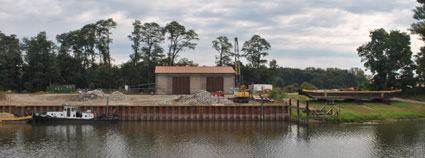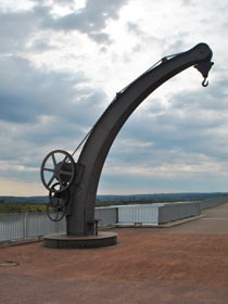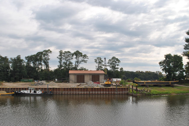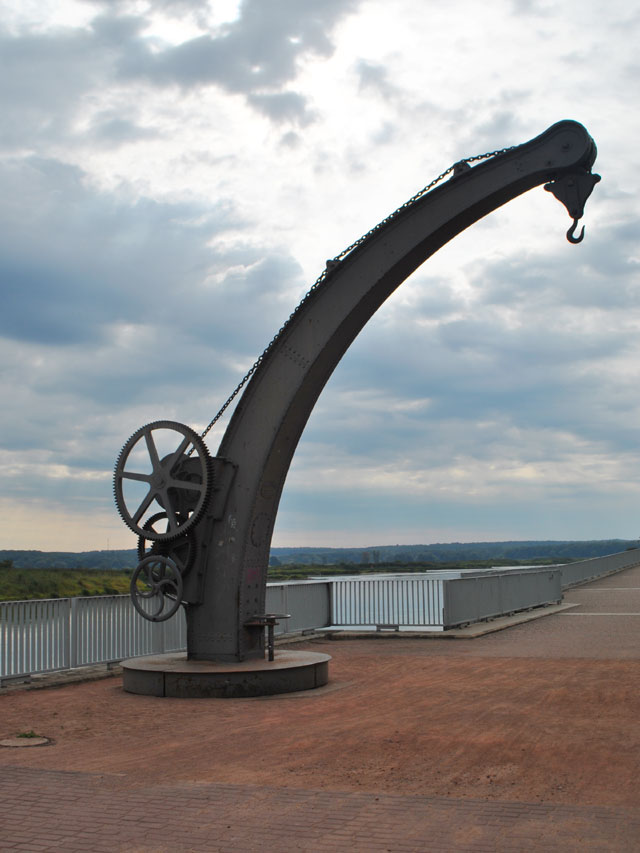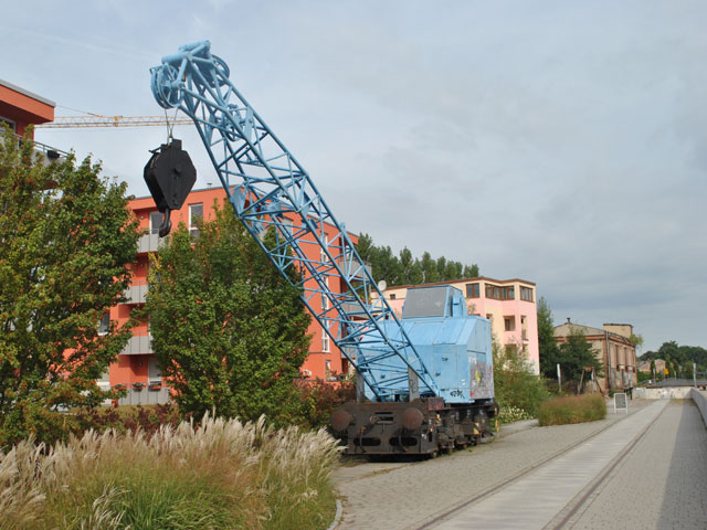 Wer die Nordroute gewählt hat, läuft weiter entlang der Oder und hat Gelegenheit, an der Hafenmauer diverse Reliquien aus besseren Zeiten der Oderschifffahrt zu bewundern, darunter auch ein stattlicher Kran auf den alten Gleisen.
