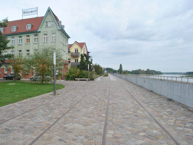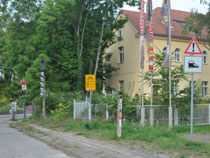 An der Marina biegt der Weg links in die Hafenstraße, passiert einen ausgedienten Bahnübergang und stößt auf die Berliner Straße, die ab hier Herbert-Jensch-Straße heißt. Es geht nun ein Stück entlang dieser Straße, die noch reichlich DDR-Charme versprüht. Dort, wo die Straße leicht nach links schwenkt, biegt der Weg wieder rechts in Richtung Oder ab.