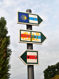 Nahe der Stadtbrücke, über die der Jakobsweg aus Polen herüber kommt, findet sich in Form zweier Wegweiser die ultimative Aufforderung, sich für eine der beiden Routen des Jakobsweges zu entscheiden.