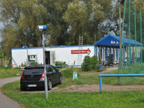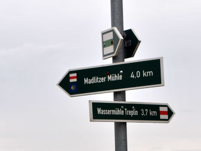 Der Jakobsweg überquert die L37 zwischen Petershagen und Jakobsdorf und kurz vor Madlitzer Mühle eine Verbindungsstraße zwischen Petershagen und Briesen. Eigentlich führt der Weg jetzt über die Madlitzer Mühle hinaus bis kurz vor Alt Madlitz und biegt dann scharf rechts ab nach Falkenberg - dicht vorbei an Petershagen. Aber es ist spät geworden und so richtig einladend ist das gut umzäunte Areal mit Nobel-Wochenendhäusern entlang des Pilgerweges auch nicht. |