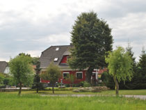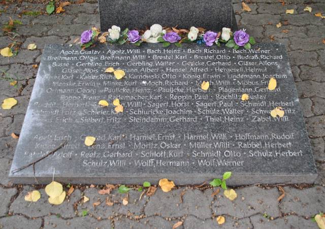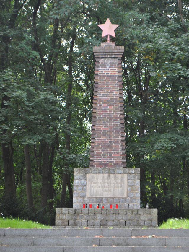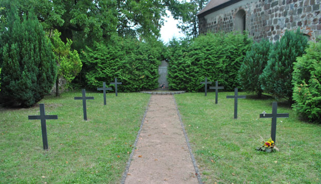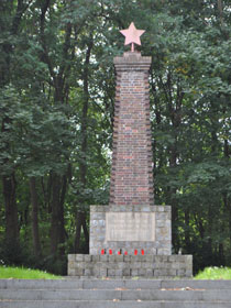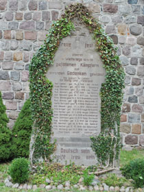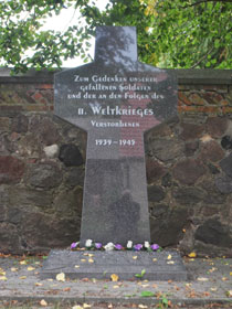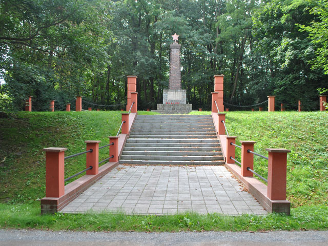 Am Ortseingang trifft man hinter der Eisenbahnbrücke auf die Straße „Am Ehrenmal“, die in ein kleines Wäldchen führt. Nur wenige Meter von der Einmündung entfernt befindet sich dort eine ansprechend gestaltete und gut gepflegte sowjetische Kriegsgräberstätte mit einem erhöht stehenden Ehrenmal. | ![]() |