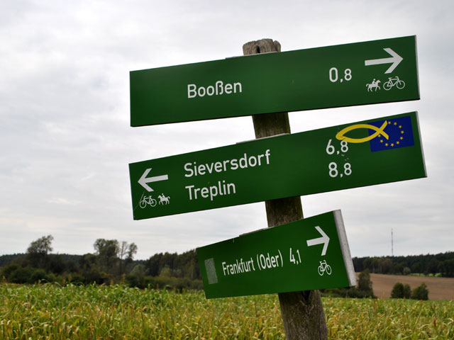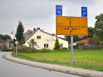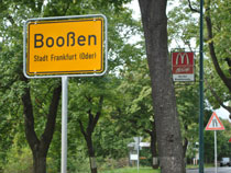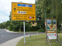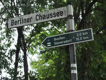 Durch die Lebuser Straße geht es 100 Meter nach Süden bis zum Kreisverkehr an der Berliner Chaussee (B5). Dort biegt man rechts ab und folgt der Straße auf dem begleitenden Fuß-/Radweg in das benachbarte Booßen. | ![]() |