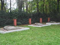 Rechts dahinter steht ein dreiseitiger Obelisk mit französischer Beschriftung. Es ist das Grabmal des in Frankfurt gestorbenen Dichters Ewald Christian von Kleist (1715-1759), der zu Zeiten des Alten Fritz Leutnant im Regiment des Prinzen Heinrich war.