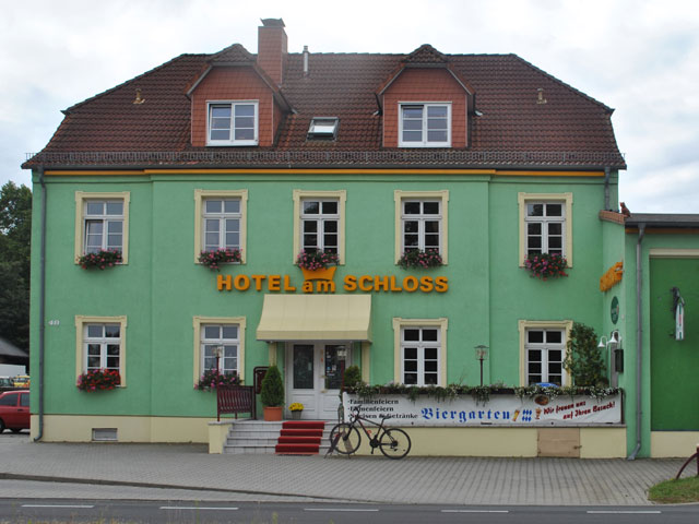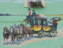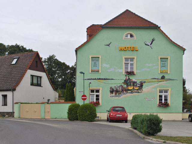 Im vorgezogenen Gebäudeteil saß der Chausseegelderheber, um von allen passierenden Kutschen und Fuhrwerken die Maut zu kassieren. Eine der mautpflichtigen Postkutschen ist ein Stück weiter an der Fassade des Hotels zu bewundern. |