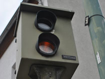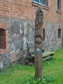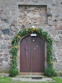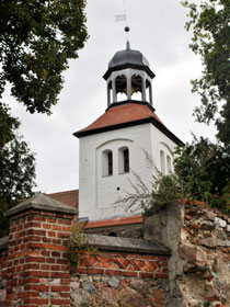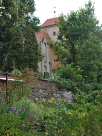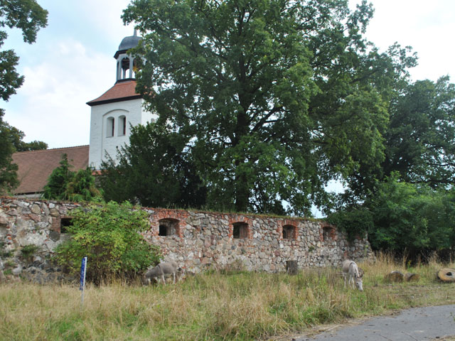 Direkt gegenüber dem rechtzeitig angekündigten Blitzer geht es links eine Treppe hoch zur Booßener Kirche, die auf einem ummauerten Hügel stehend über dem Ort thront. | ![]() |