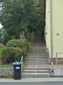 Hinter dem Grundstück des Entsorgungsunternehmens „Veolia“ biegt der Jakobsweg zusammen mit den anderen Wanderwegen gut ausgeschildert nach links in die Straße „Am Schlachthof“ ein, die eine Überraschung birgt. |