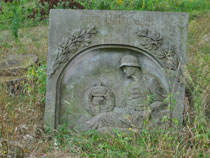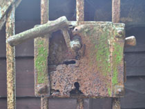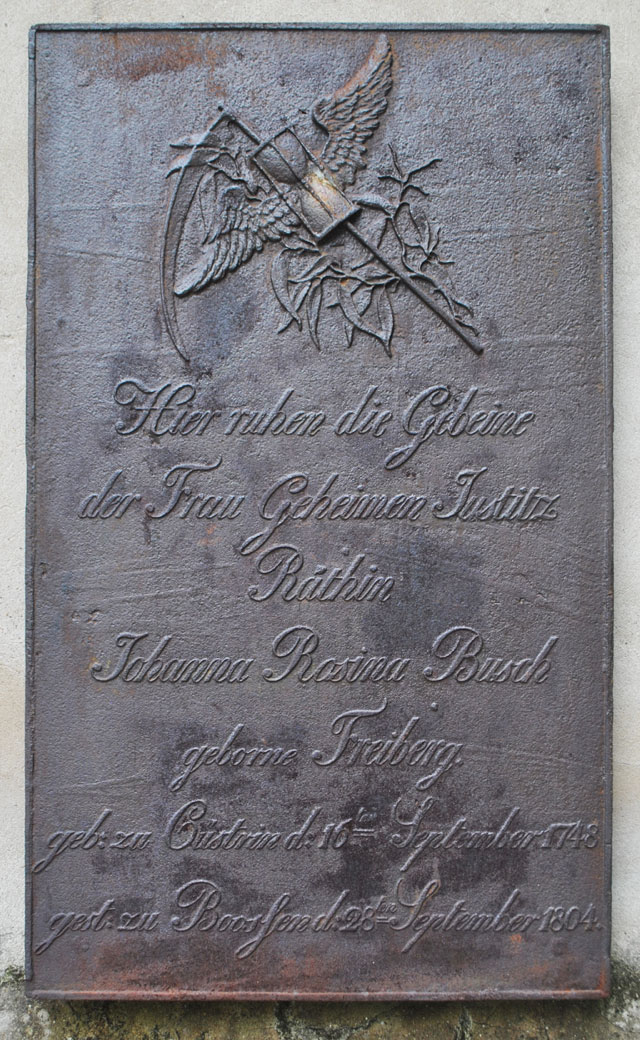 Auf dem Booßener Kirchhof hat, halb von Gras und Erde bedeckt, ein Gedenkstein mit der Inschrift „Fürs Vaterland“ / „In Treue fest“ aus dem ersten Weltkrieg überlebt. Das Schloss an der Friedhofstür ist mindestens genauso alt und ebenfalls nicht mehr in bestem Zustand. |