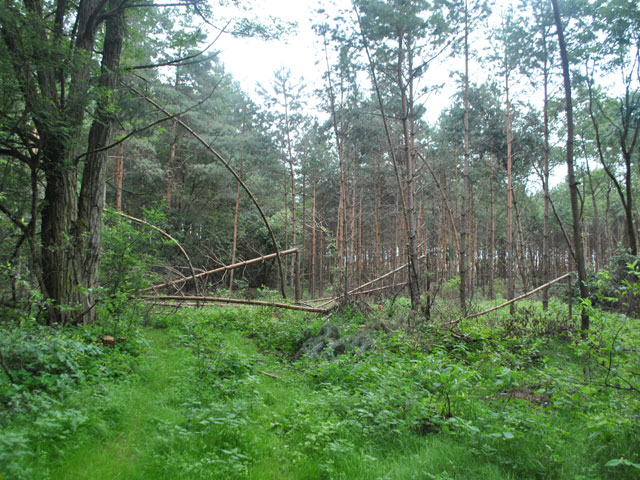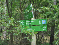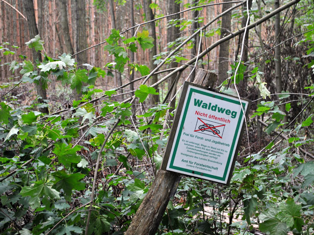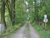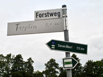 Etwa 150 Meter hinter dem Abzweig nach Wulkow (wo das bekannte, UFO-ähnliche Ökohaus steht), geht es links in den nach Sieversdorf ausgeschilderten Forstweg, der nach wenigen Hundert Metern die B112 überquert. | ![]() |