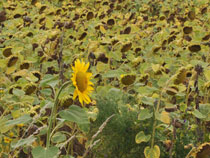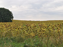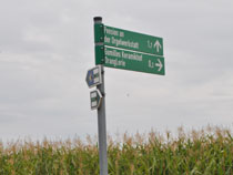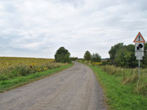 Da wir den Jakobsweg und nicht den Dienstweg gehen wollen, können wir das Schild „Dienstweg nur für Befugte“ an der Brücke über die B112 ignorieren. Der etwas staubige, aber sehr ruhige Weg nach Sieversdorf schlängelt sich durch große Sonnenblumenfelder. Da er gut ausgeschildert ist, muss hier nicht jede Biegung des Weges erklärt werden. |