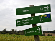 Weiter geht es auf dem Lichtenberger Weg nach Sieversdorf. Ein Wegweiser wirbt schon mal für die Pension an der Orgelwerkstatt in Sieversdorf und einen Keramikhof im „Ausbau“, zu dem man abbiegen müsste. |