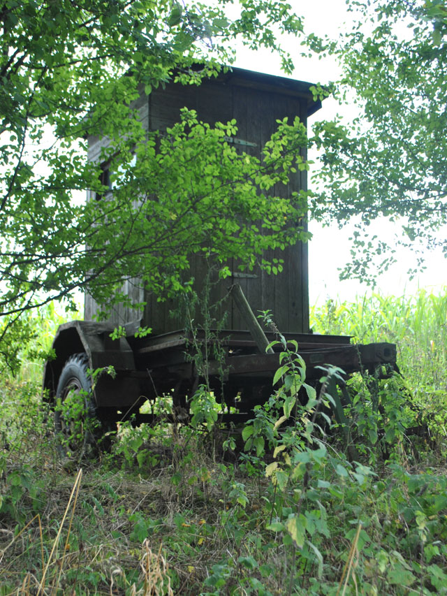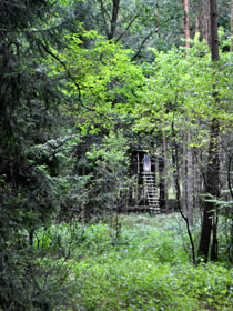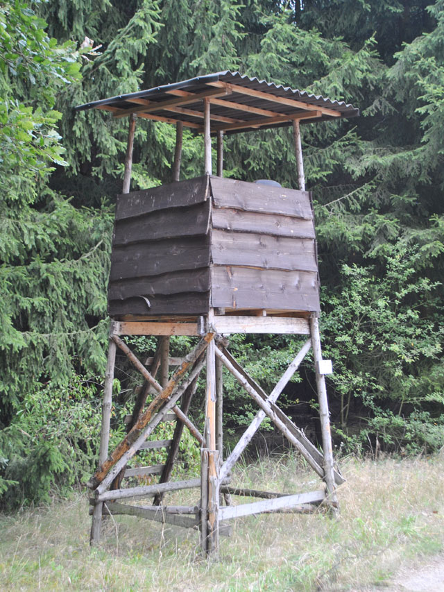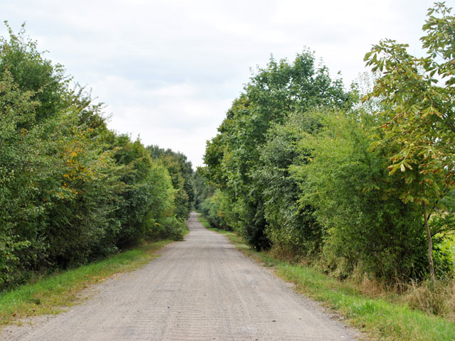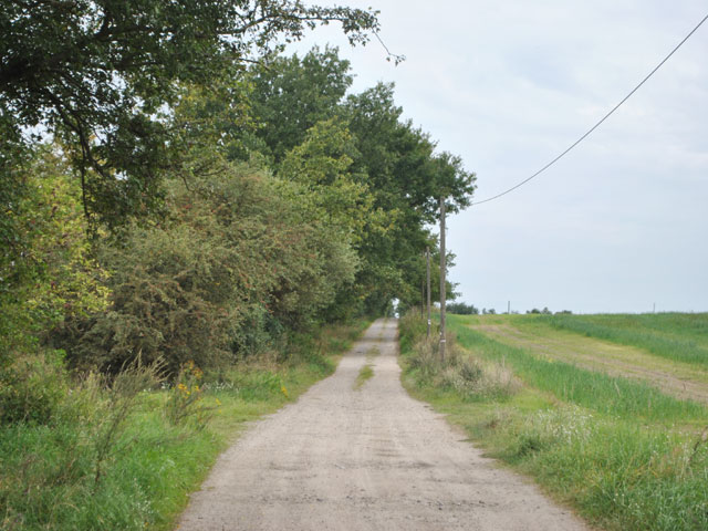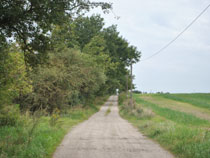 Der Weg führt zunächst schnurgerade gen Westen und ist beidseits von Bäumen eingefasst. Wenn der Jäger nicht gerade auf seinem Hochstand sitzt, können die Rehe hier ganz ungestört über den Weg schlendern. |