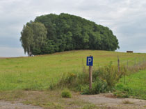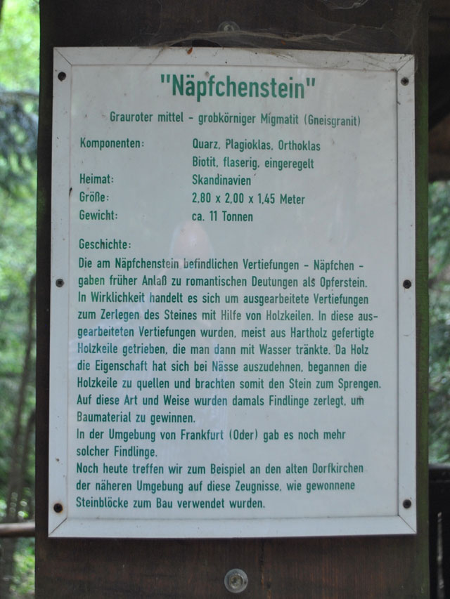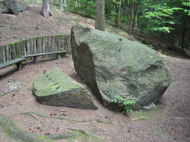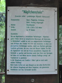 Auf der Info-Tafel neben dem Stein erfährt man, dass die näpfchenartigen Vertiefungen, die dem Stein seinen Namen gaben, keinesfalls auf einen Opferstein hindeuten, sondern zum Spalten des Steins mittels Holzkeilen dienten. | ![]() |