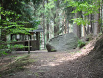 Den Wanderer erwarten ein 11 Tonnen schwerer Findling aus Skandinavien, umgeben von Bänken, und eine Schutzhütte, in der man auch mal einen Regenguss überstehen könnte.