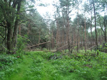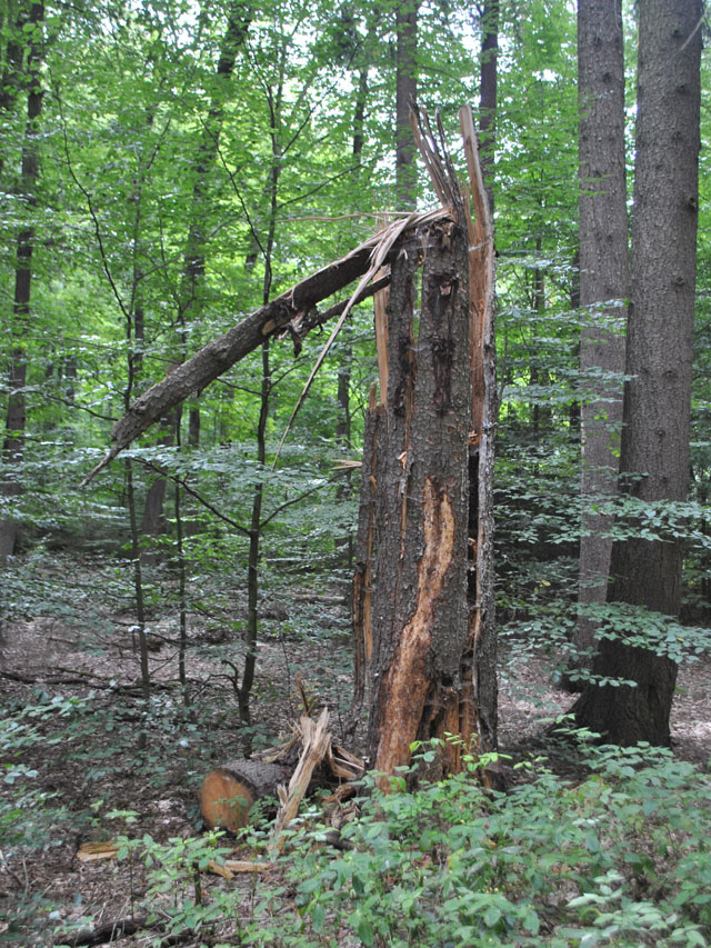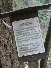 Ein Stück weiter wird an einem vom Blitz getroffenen Baum erklärt, welche Spuren ein Blitzeinschlag am Baum hinterlässt: Blitzleisten. Was Sturm im Wald an Schaden hinterlässt, kann man auch an einigen Stellen sehen. |