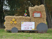 Eine prächtige Lokomotive aus Strohballen wirbt im Dorfkern für das Dorffest, das in zwei Wochen stattfinden soll.