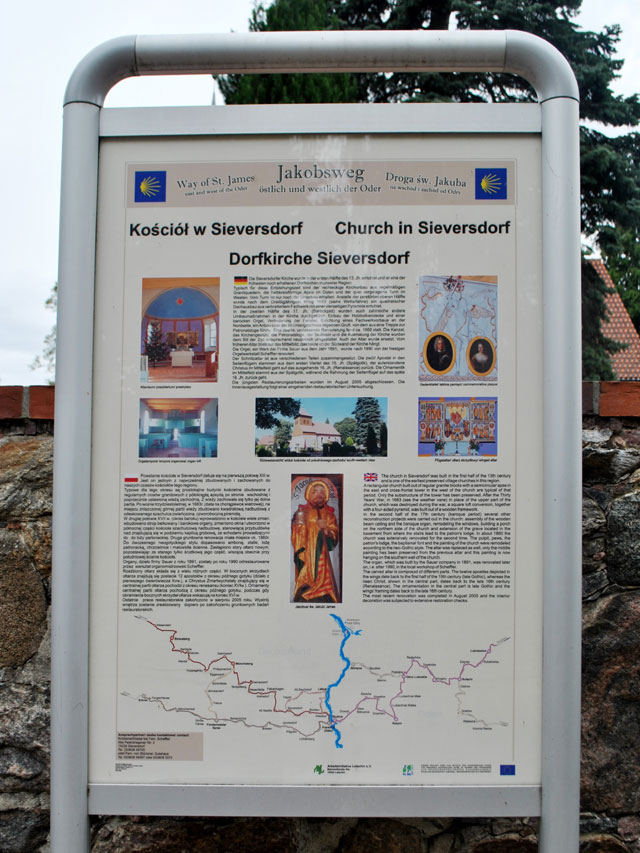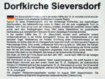 Auf einer Info-Tafel erfährt man, dass die aus regelmäßigen Granitquadern bestehende Sieversdorfer Kirche aus der ersten Hälfte des 13. Jahrhunderts stammt. Der im Dreißigjährigen Krieg zerstörte Turm wurde später durch einen Holzturm ersetzt. |