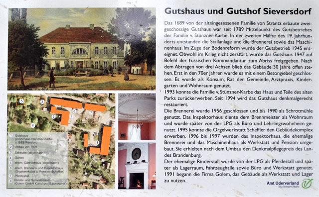 Das Gutshaus von Sieversdorf wurde 1689 erbaut und war später der Mittelpunkt des Gutsbetriebes. Zusammen mit weiteren zwischenzeitlich entstandenen Gutsgebäuden wurde es nach dem zweiten Weltkrieg enteignet und unter anderem von der LPG genutzt. Jetzt ist es wieder im Besitz der früheren Gutsbesitzerfamilie. Andere Gebäude des Gutshofes werden von einer Orgelwerkstatt und als Pension genutzt. |