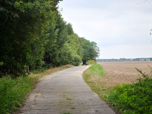 Wie später eine Tafel am Wegesrand aufklärt, ist dieser Plattenweg Teil des „Lebuser Landweges“, der sich im weiteren Verlauf mit der Alternativroute des Jakobsweges von Frankfurt über Lebus deckt. So ganz geschichtslos ist man also auch hier nicht unterwegs.