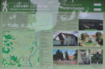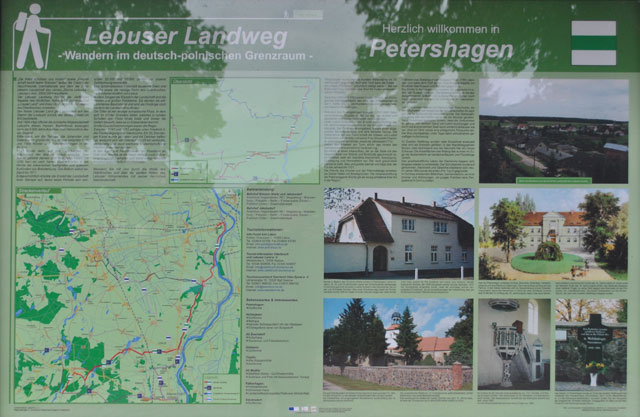 Petershagen wurde vermutlich im 13. Jahrhundert gegründet, wird aber erst 1405 erstmals in einer Urkunde erwähnt. Auch hier gab es im Dreißigjährigen Krieg starke Zerstörungen. Auf der Infotafel zum Lebuser Weg erfährt man außerdem, dass sich im Siebenjährigen Krieg (1756-1763) am Madlitzer See Russen und Preußen gegenüber standen und die Dörfer ringsum mussten die Invasion der Russen ertragen. Ab 1840 begann man gezielt mit der Suche nach Braunkohle und deren Abbau unter Tage nahm schnell Fahrt auf. |