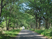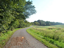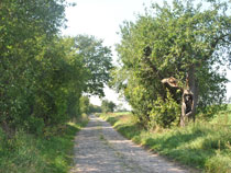 Der Weg ist teilweise mit Feldsteinen gepflastert und über weite Strecken mit Schatten spendenden Bäumen bestanden. |